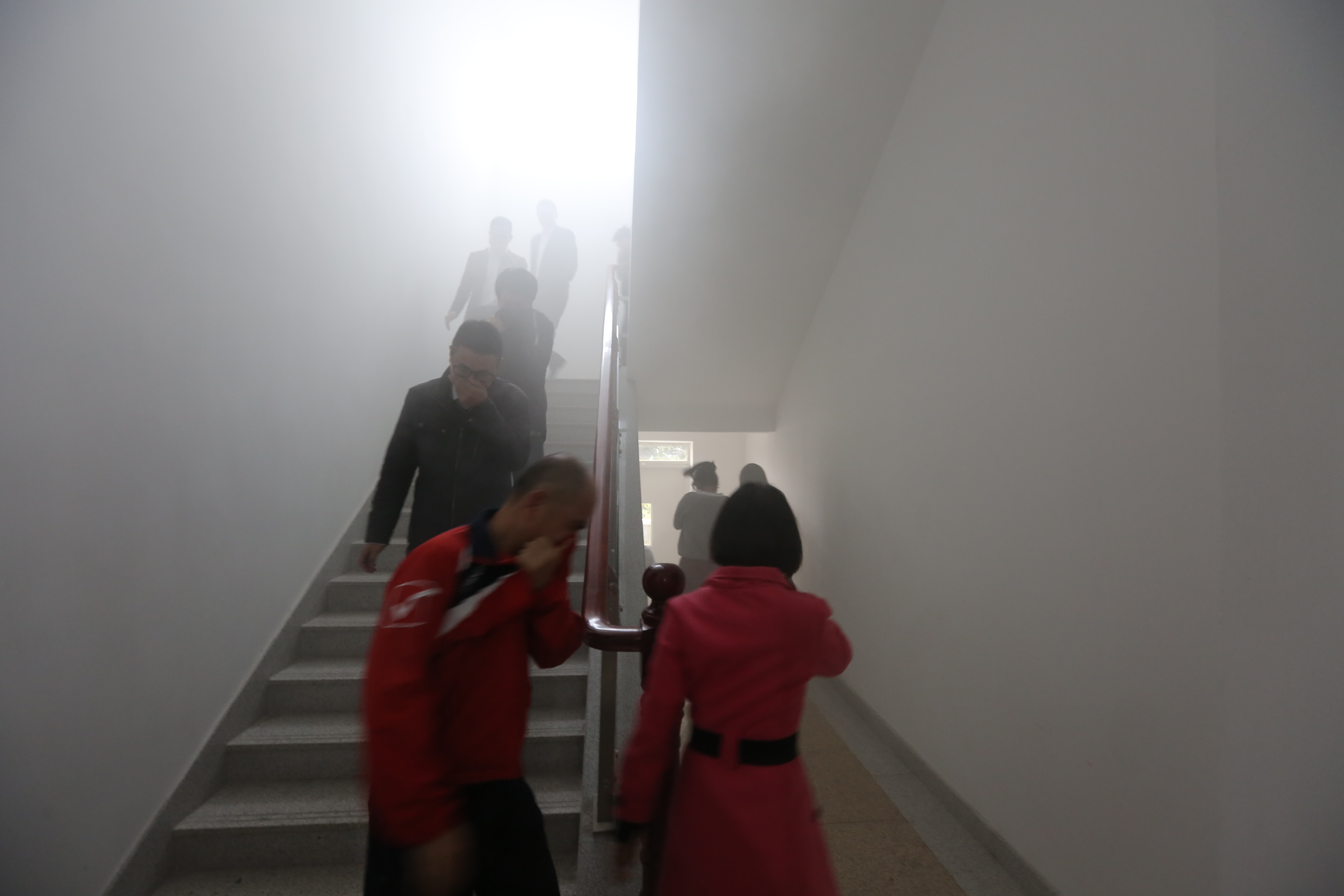 模拟发生火灾情景,办公楼人员正在进行紧急疏散
