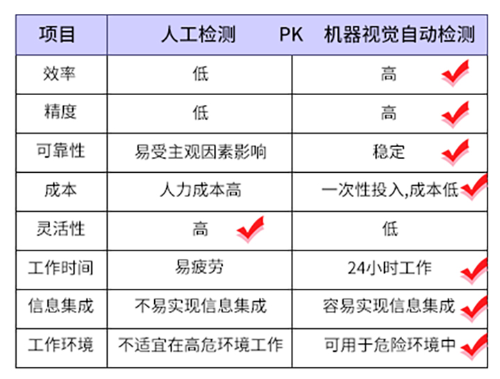 机器视觉是一项综合技术,其中包括数字图像处理技术、机械工程技术、控制技术、光源照明技术、光学成像技术、传感器技术、模拟与机器视觉技术、计算机软硬件技术、人机接口技术等。如表1所示,机器视觉的显著优点主要包括以下几点: