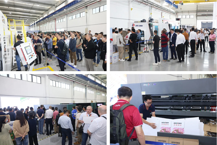 在这场精彩纷呈的活动中,最让人翘首以待的部分莫过于子公司带来的多款产品开机演示。下午15时,东方之星I 、 亚太之星I、万德数科WD200-60A++Single pass高速印刷开槽联动线三台产品线三台设备依次启动,现场的气氛达到了高潮。一叠叠印刷精美、精准成型的纸箱飞快的呈现在众人面前。各位来宾紧紧围住机器,拿起印刷好、装订成型的纸箱,不断向销售人员咨询各种问题,或是互相交流意见。