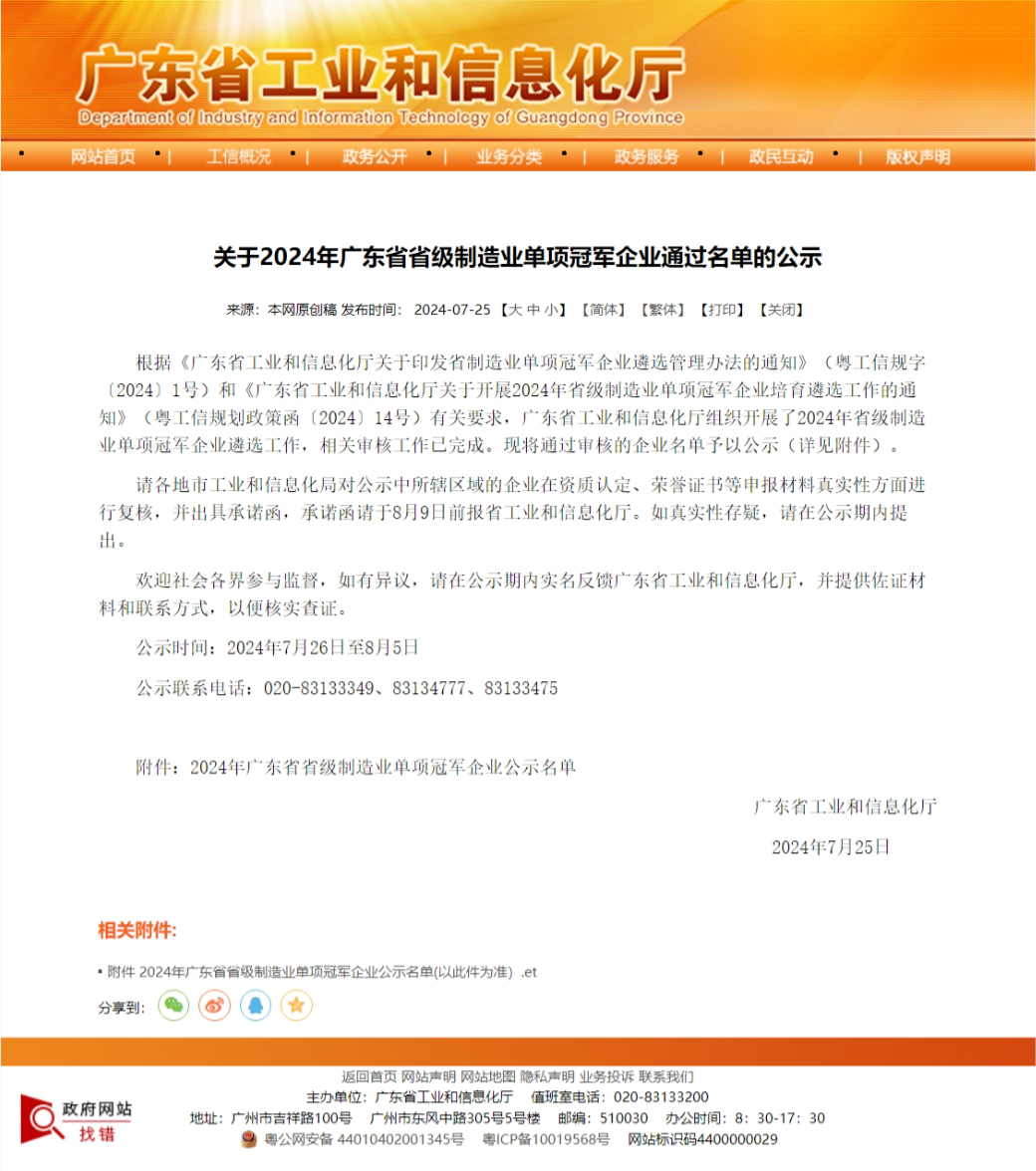近日,广东省工业和信息化厅正式公示2024年省级制造业单项冠军企业通过名单,该名单通过专家评审和资金项目评审委员会的审核,确保入选企业不仅在技术创新和市场地位上达到高标准,而且对地方经济发展和产业升级具有积极的促进作用。