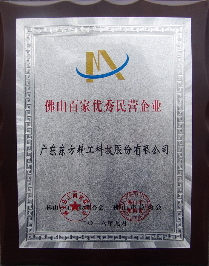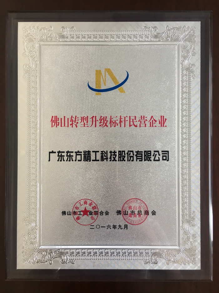 Foshan city federation of industry and commerce officially released the report of Foshan's private economic development in 2016, and published the list of 100 excellent private companies in Foshan city, 20 typical private companies in the transformation and upgrading of Foshan city in 12th October. On years of steady development and transformation and upgrading of outstanding performance in recent years, DongFang Precision has been listed on “Foshan city transformation and upgrading of private company benchmarking" and "outstanding private company in Foshan city’ at the same time, become the initiative transformation of outstanding private company in the aspect intelligent manufacturing, quality and efficiency improvement, the Internet +, science and technology innovation under the new economy trend.