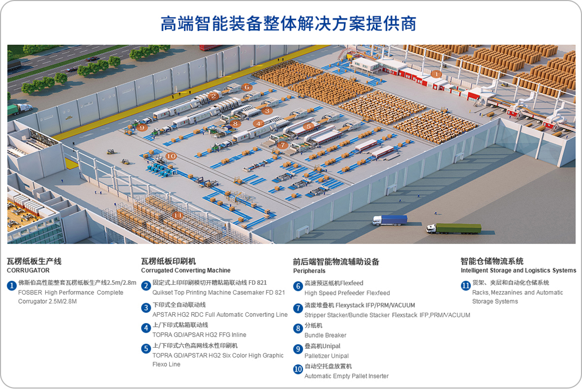 我们通过国内外的并购及战略合作实现了“国际化”发展、“全产业链”延伸和“战略”转型。通过与意大利Fosber集团的合作,并在中国成立Fosber(Asia)合资公司,主要面对亚洲市场研发、生产高端瓦楞纸板生产线,成功实现Fosber品牌在全球的战略布局。与意大利EDF 共同出资设立合资公司,生产与瓦楞纸箱印刷机配套使用的印前印后自动化设备,为全球客户提供从智能包装到智能仓储物流系统的整体解决方案,引领中国制造向智能自动化的发展和升级。我们依托智能包装产业链为基础,打造智能物流全产业链,并沿着“中国智能制造”方向,在中国产业转型升级发展的关键阶段,带领产业智能转型,最终实现“智能包装”、“智能工厂”、“智能制造”解决方案这一战略愿景。